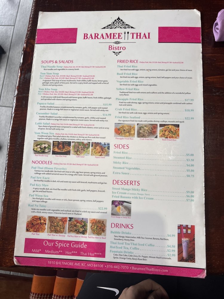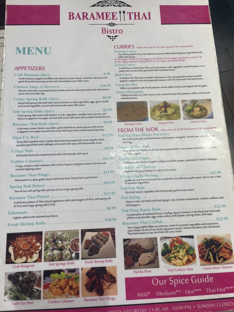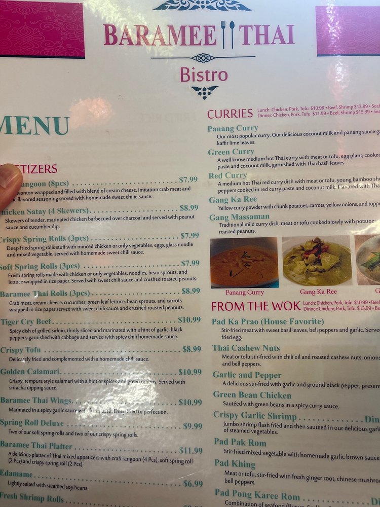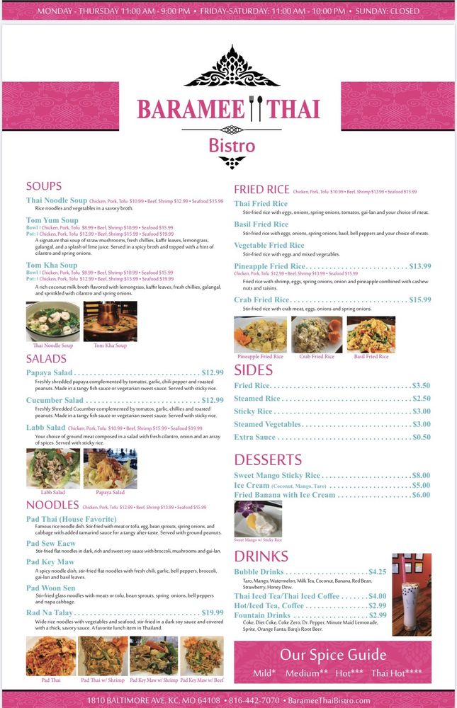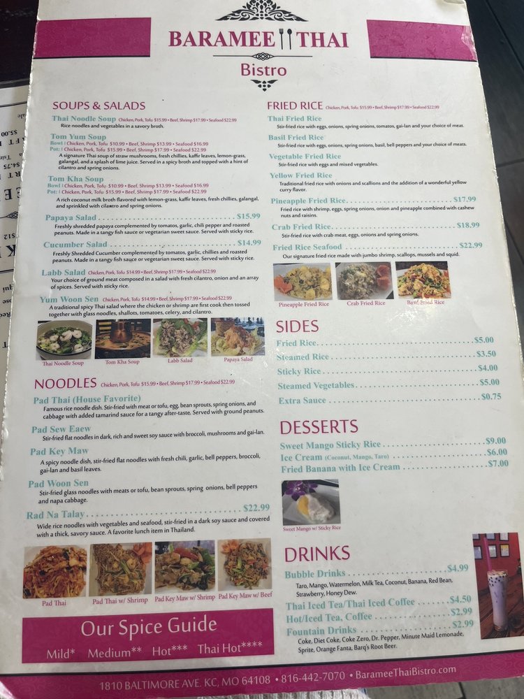 Baramee Thai Bistro, located in Kansas City, offers a diverse menu of authentic Thai cuisine with options for vegans and vegetarians. The appetizers like Crab Rangoon and Tiger Cry Beef showcase the flavors of Thailand. The bubble drinks and soft drinks provide refreshing beverage choices to complement your meal. Customers rave about the quality of food and service, highlighting dishes like Panang Curry, Yellow Curry, Pad Thai, and Crab Rangoon. The ample portions and reasonable prices make dining here a great value. The cozy atmosphere, quick service, and outdoor seating add to the overall dining experience. Whether you're a Thai food enthusiast or trying it for the first time, Baramee Thai Bistro promises a satisfying meal with delicious flavors and friendly service.