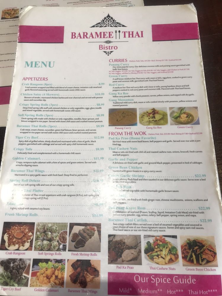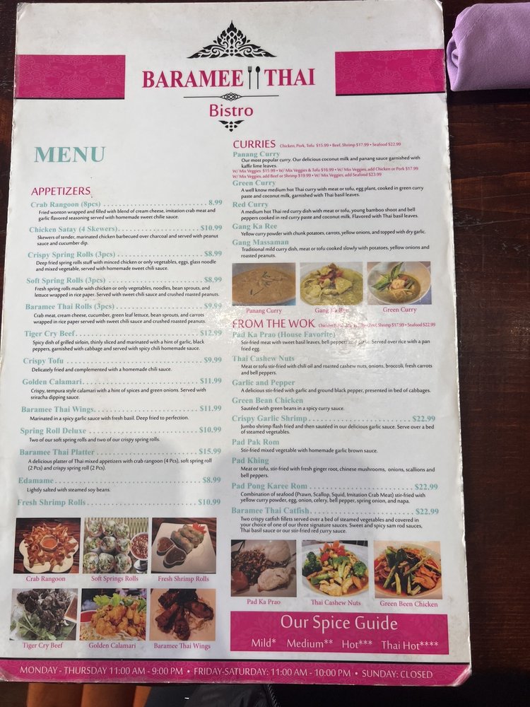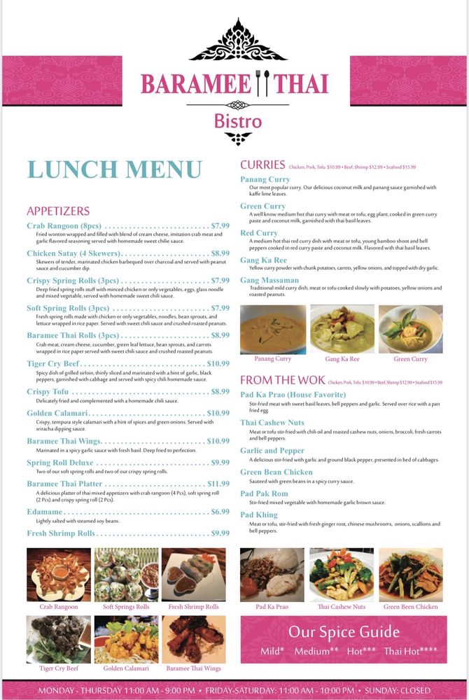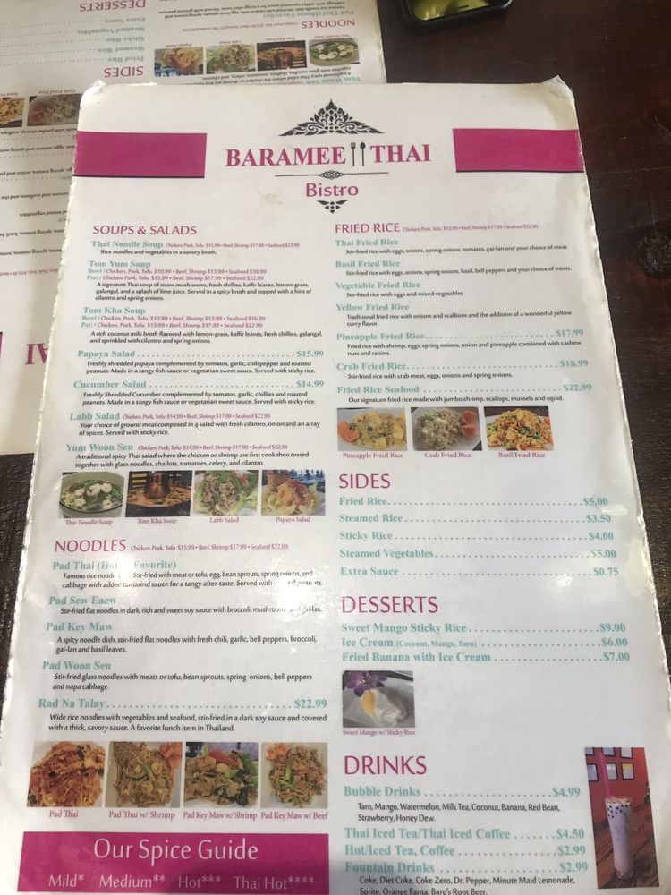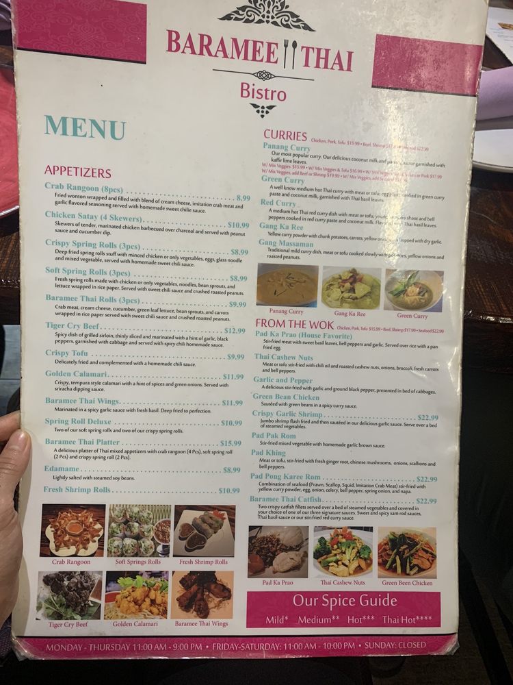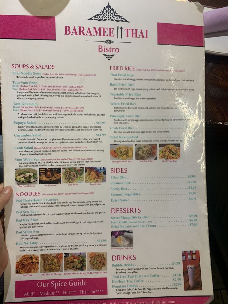 Baramee Thai Bistro, located in Kansas City, offers a diverse menu of authentic Thai cuisine with options for vegans and vegetarians. The appetizers like Crab Rangoon and Tiger Cry Beef showcase the flavors of Thailand. The bubble drinks and soft drinks provide refreshing beverage choices to complement your meal. Customers rave about the quality of food and service, highlighting dishes like Panang Curry, Yellow Curry, Pad Thai, and Crab Rangoon. The ample portions and reasonable prices make dining here a great value. The cozy atmosphere, quick service, and outdoor seating add to the overall dining experience. Whether you're a Thai food enthusiast or trying it for the first time, Baramee Thai Bistro promises a satisfying meal with delicious flavors and friendly service.